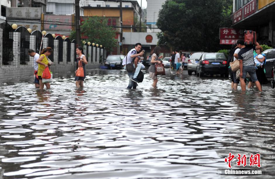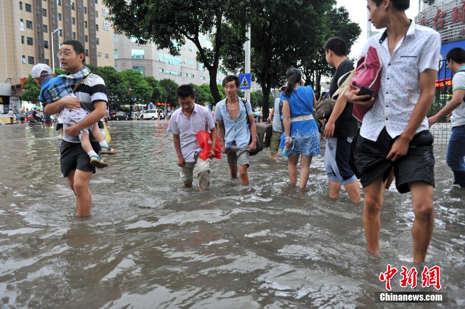 7月23日,今年第10号台风“麦德姆”穿越台湾海峡后,于当日15时30分许在福建福清登陆。“麦德姆”给福建沿海地区带来狂风暴雨,许多广告牌,福州市区多处路段积水成灾。图为民众艰难出行。 中新社发 吕明 摄