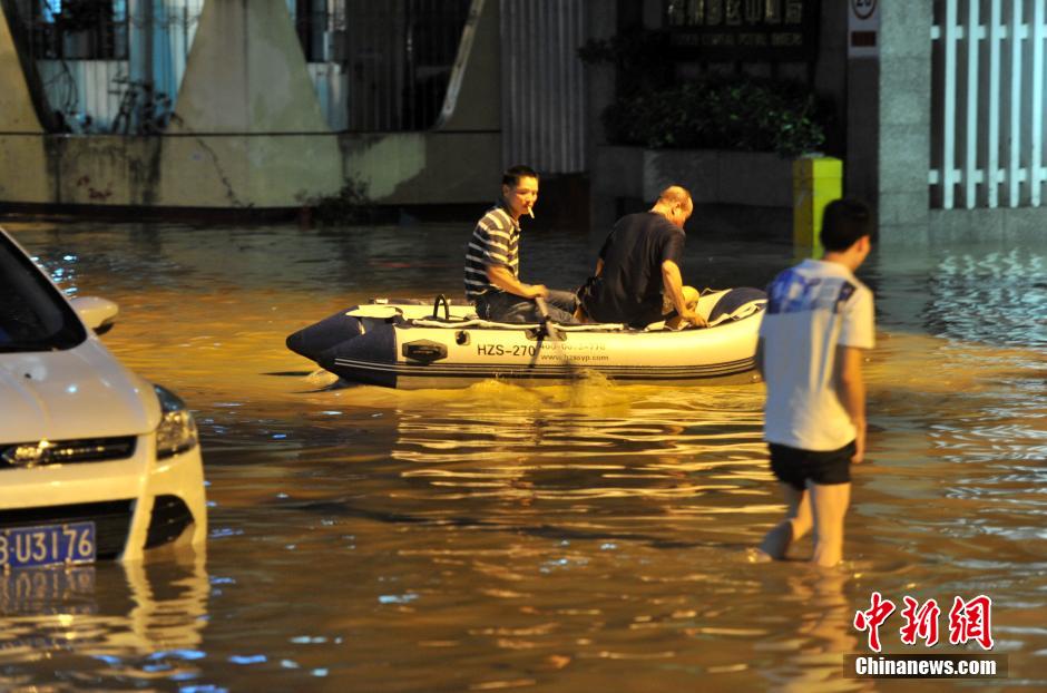 7月23日,今年第10号台风“麦德姆”穿越台湾海峡后,于当日15时30分许在福建福清登陆。“麦德姆”给福建沿海地区带来狂风暴雨,许多广告牌,福州市区多处路段积水成灾。图为福州民众在积水比较严重的路段使用皮划艇出行。 中新社发 吕明 摄