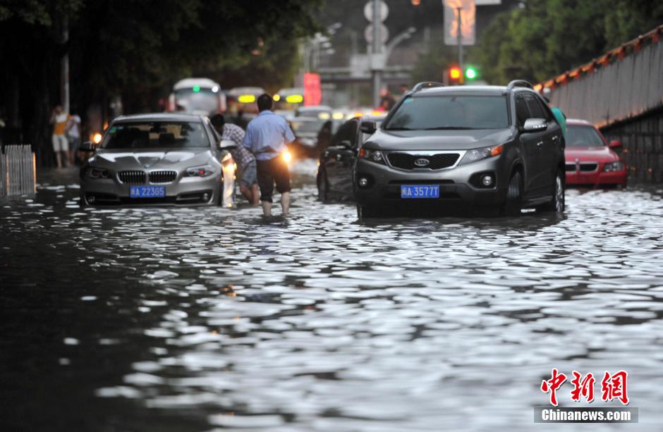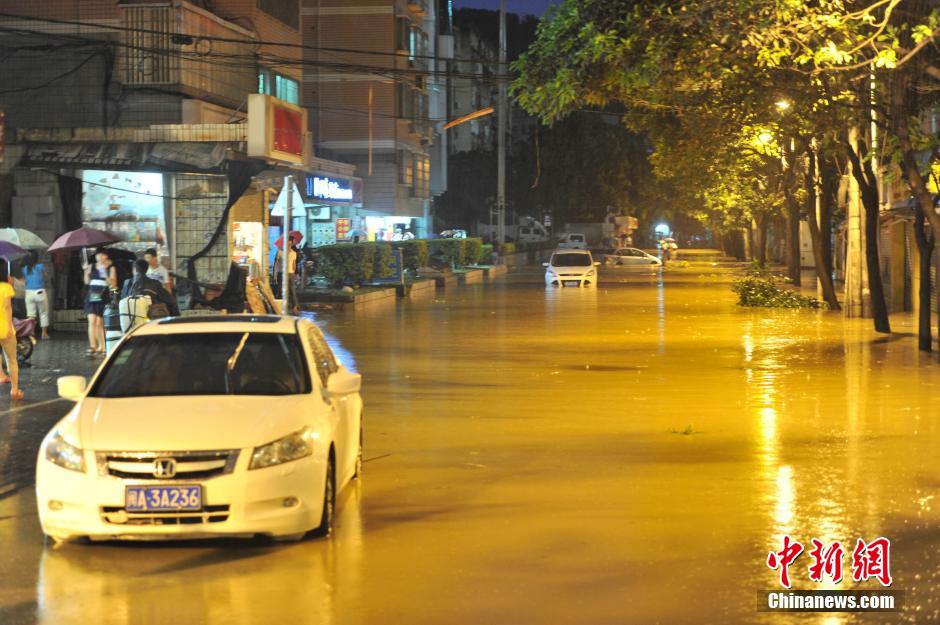 7月23日,抛锚于积水中的小车正在等待救援。今年第10号台风“麦德姆”穿越台湾海峡后,于当日15时30分许在福建福清登陆。“麦德姆”给福建沿海地区带来狂风暴雨,许多广告牌,福州市区多处路段积水成灾。 中新社发 吕明 摄