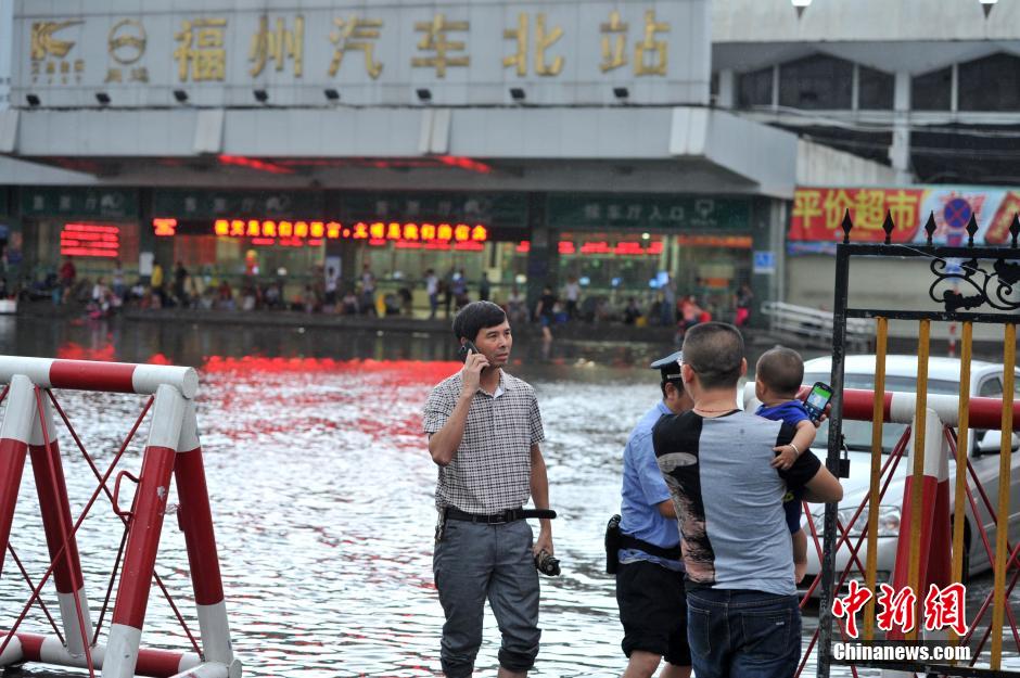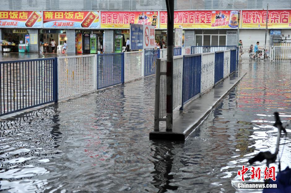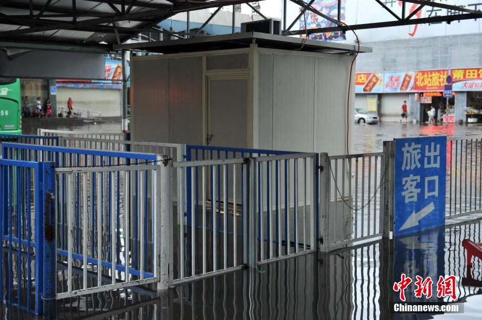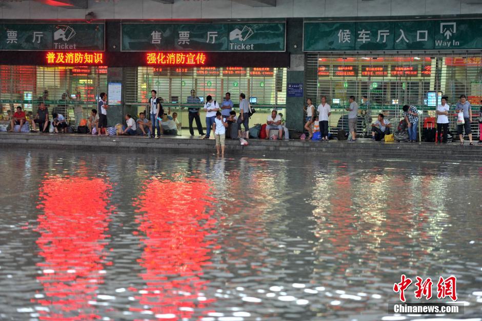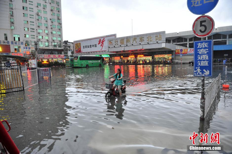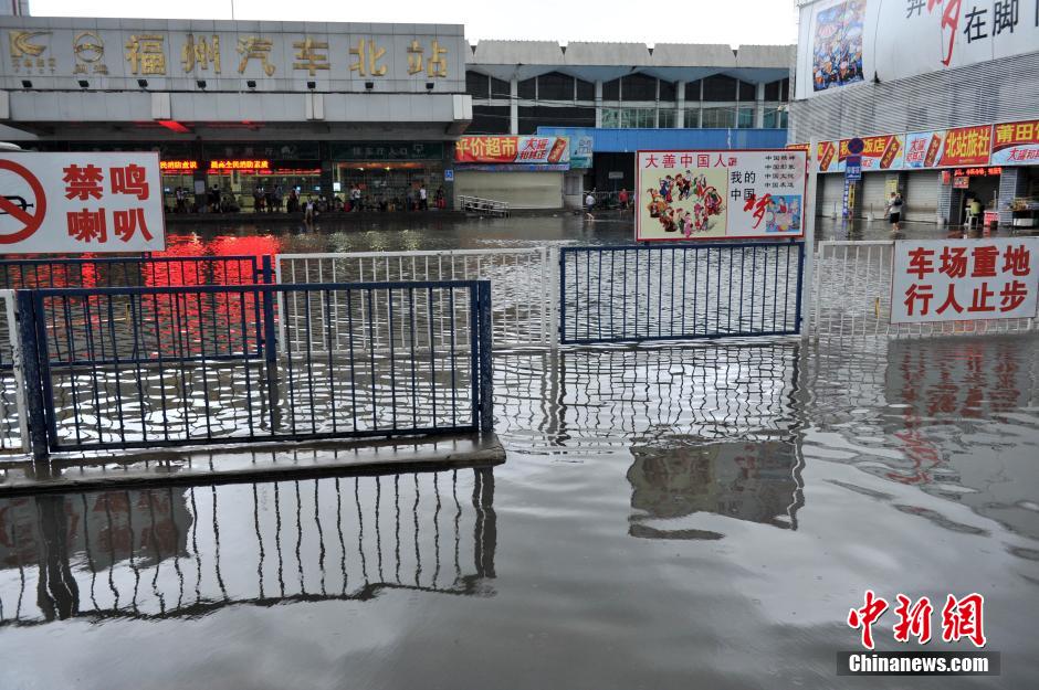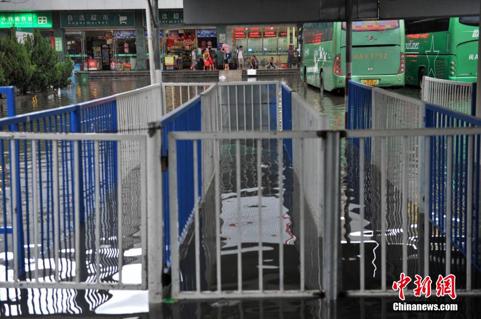 7月23日,今年第10号台风“麦德姆”穿越台湾海峡后,于当日15时30分许在福建福清登陆。“麦德姆”给福建沿海地区带来狂风暴雨,许多广告牌,福州市区多处路段积水成灾。图为福州汽车站广场被淹。 吕明 摄