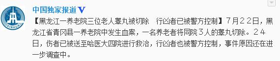 人民网北京7月24日电 据新华社对外部微博“中国独家报道”消息,7月22日,黑龙江省青冈县一养老院中发生血案,一名养老者将同院3人的睾丸切除。
