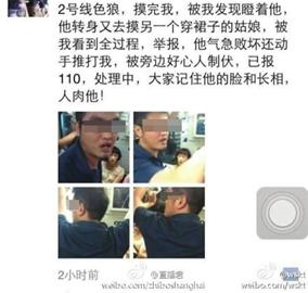 东方网7月25日消息:据《i时代报》报道,前段时间,闹得沸沸扬扬的“9号线色狼”事件刚告一段落,近日又有女白领陈小姐报警称遭遇疑似“色狼”,但因车厢拥挤摄录装置无法确定该男子行径,最终涉事男子被教育放行。陈小姐将自己的遭遇发至微博,同时上传照片发起“人肉”,引发大量转发和热议。