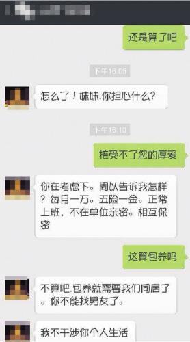 而多次遭到宋丽拒绝后,该男子又将每个月的价格提到了15000元。此外,该男子还称这不是包养,“包养就需要我们同居了,你不能找男友了。”
