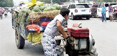 (事情解决了,陈建帮摇起拖拉机,准备离开。远处是被撞的路虎)