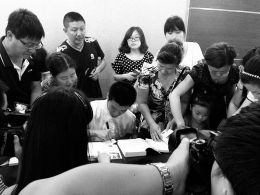 7月20日下午,在晋城市实验中学会议室,不少人拿着厚厚的书籍围拢在一张桌子前,一名身着白色衬衣的青年男子右手拿着笔,吃力地在书的扉页上签下“赵秋凯”三个字。