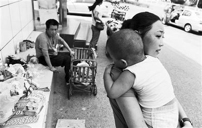 昨天下午,良乡华冠购物中心附近,金花和母亲彩虹一样呆滞无神地盯着满大街的人群,似乎她和若干兄弟姐妹们的命运已然无法改变。(记者 杨琳 摄影/记者 袁艺)