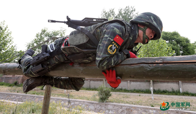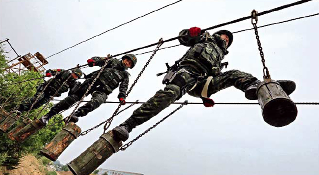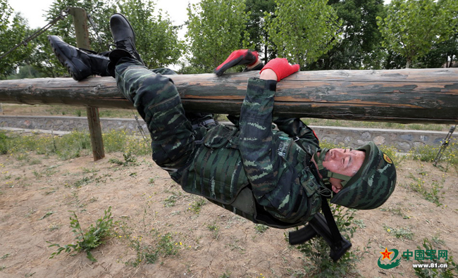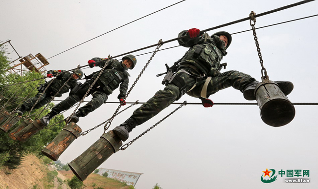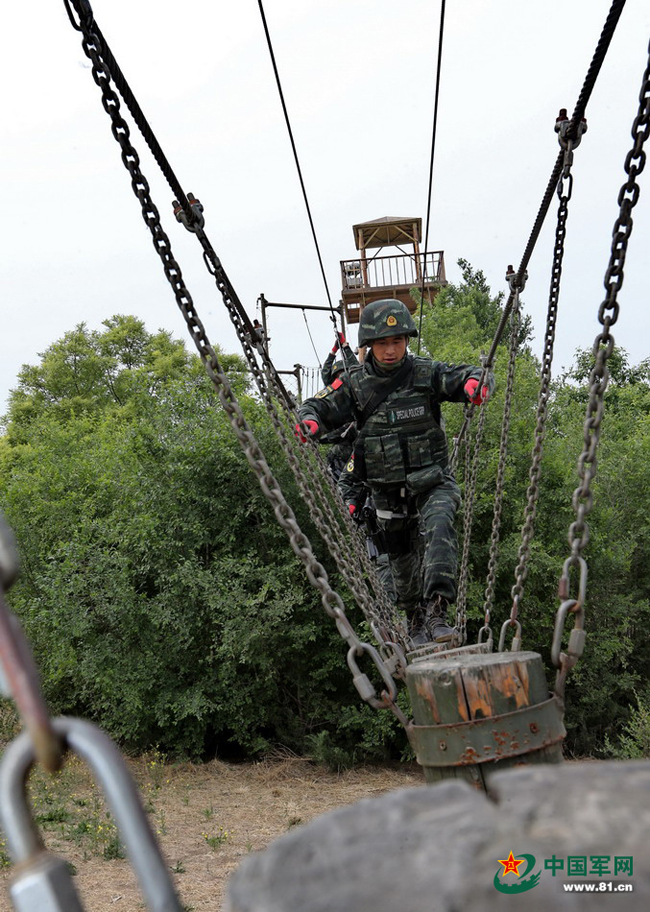 猎鹰突击队猎人训练特战队员过摆动单轨的场景。本网记者乔天富 摄