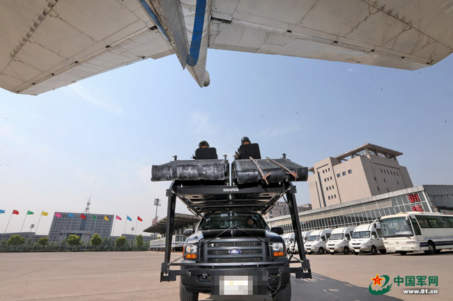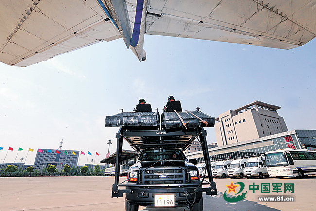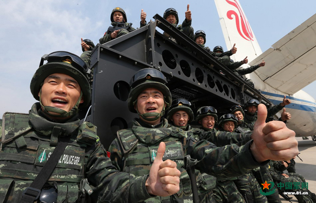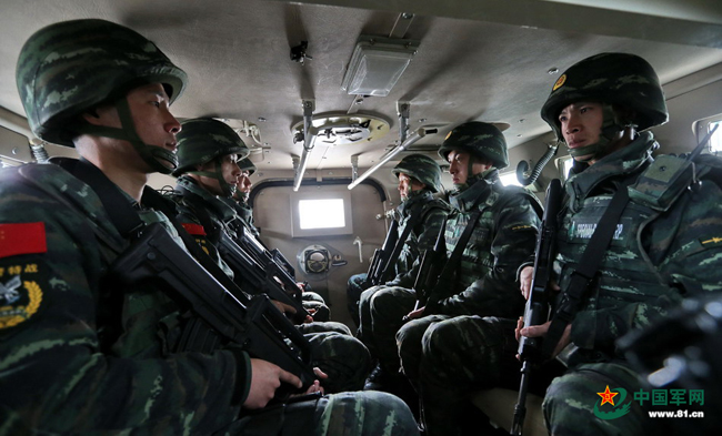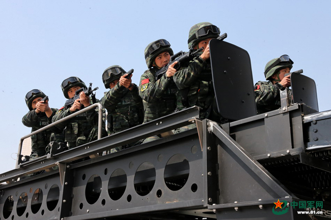 猎鹰突击队装备精良。图为乘坐轮式装甲车的猎鹰突击队队员。本网记者乔天富 摄