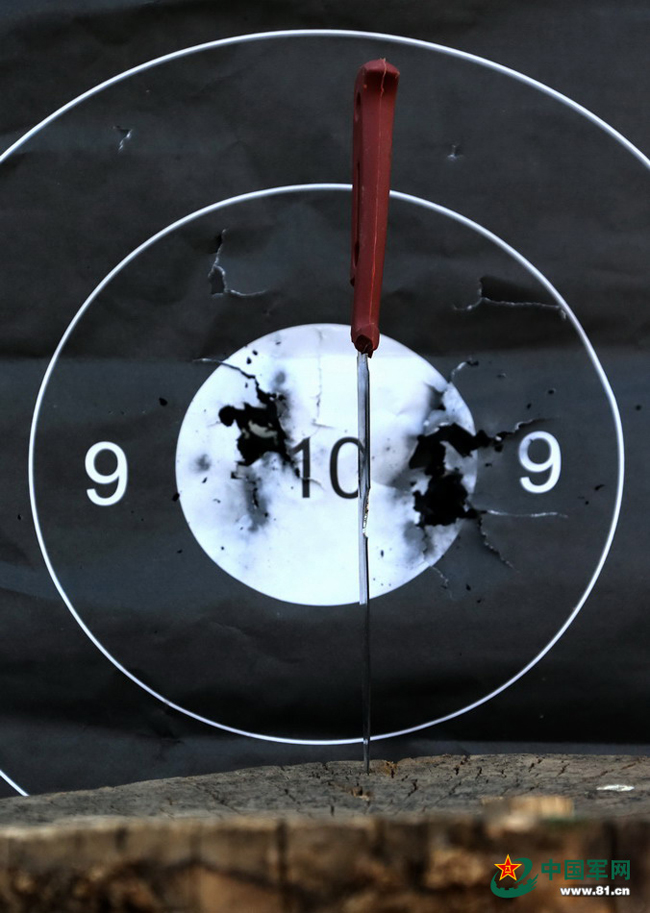 狙击,是猎鹰突击队队员们的看家本领。猎鹰突击队的狙击手们人人练就了一枪毙敌的硬功。5月5日下午,二队队员、狙击手王道斌中尉在给记者表演了射击中靶前立刀,一声枪响,刀劈弹头,一弹两孔,命中靶心的绝活。这是刀、靶被命中的情景。本网记者乔天富 摄