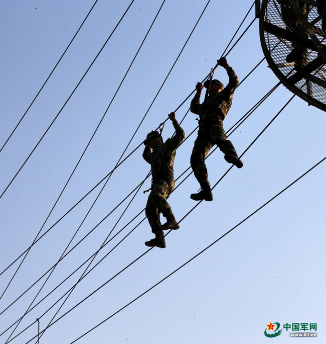 猎鹰突击队猎人训练中队员们过丛林绳桥的情景。本网记者乔天富 摄