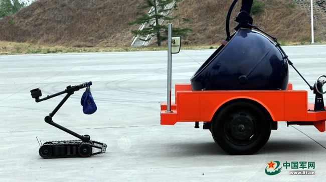 猎鹰突击队防爆队员遥控操纵机器人排除 “爆炸物”。本网记者乔天富 摄