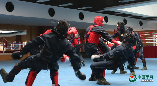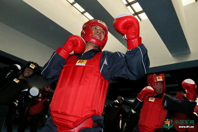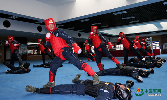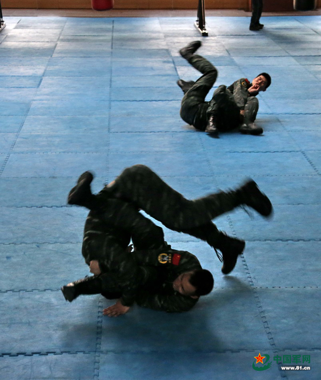 徒手搏击,是猎鹰突击队队员的又一看家本领。猎鹰突击队的队员们人人练就了一招制敌的硬功。这是他们在搏击馆训练。本网记者乔天富 摄