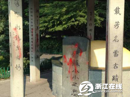 【摘要】有网友报料称,杭州西湖边的武松墓和苏小小墓的墓碑被泼上了疑似红漆。记者经初步了解,此事可能发生3日晚上,目前有关部门正在对墓碑进行清理。景区公安表示已介入此事。