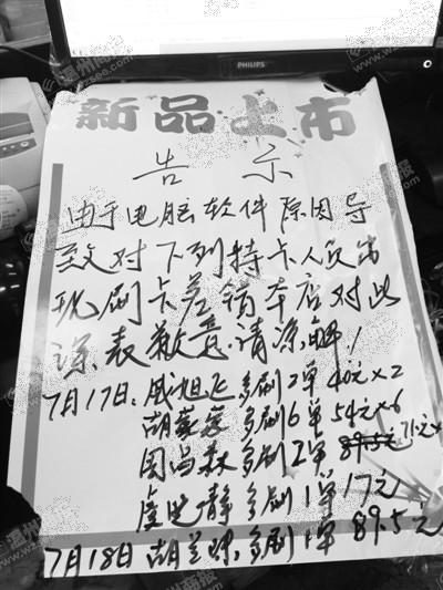 告示称,多刷是由店内的电脑软件导致。当天给周昌森埋单的收银员潘小姐称:“当时刷卡时电脑显示‘乱码’、‘数据库非法破坏’、‘请与供应商联系’等字样,连续三次刷卡都这样,我认为刷卡没成功,最后叫另一名收银员来刷卡,这次是正常的。”