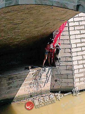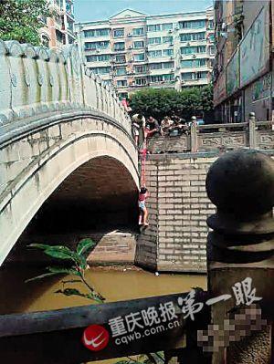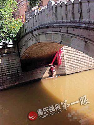 “麻烦你们帮我拉到!”女子将横幅一头缠在腰间,打了个结,再将另一头递给几名男子,要他们将另一头捆在桥栏杆上,拉着横幅把自己放到堤下河面。