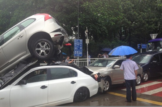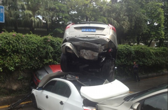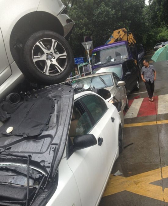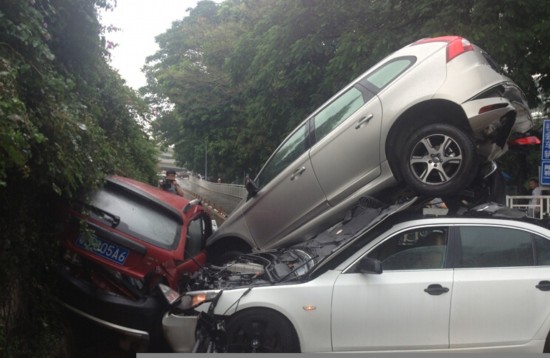车辆刹车失灵,径直撞向路边一排4辆小车,依次撞击下的头车再横向侧面撞击第5辆小车,造成6车相撞的事故。事故中,两人受伤被送医院检查。
