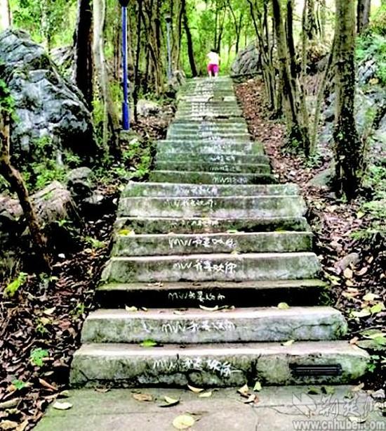 记者追访:博主小谭今年22岁,是名大三的学生,家住咸宁市通山县。暑假在家,她每天都会去家附近的凤池山上锻炼。前几天的一个下午,她和妈妈照例上山,发现台阶上写着粉笔字,“mw我喜欢你”。“我上次来的时候还没有,应该就是这两天早上写上去的。全是同一个笔迹,给同一个人的表白。”小谭说。因为好奇,她和妈妈决定顺着写了字的台阶一直往上走,看看到底写了多少级台阶。母女俩从收费站一路爬到山顶,发现上千级台阶都写了字。山顶上,还有人在地上画出了一个爱心的形状,并写上了“我们在一起吧”。