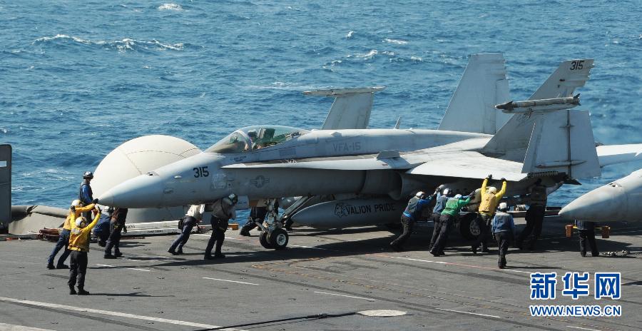 这张美国海军8月8日提供的照片显示,在海湾地区执行任务的“乔治·H·W·布什”号航空母舰上,地勤人员指挥一架F/A-18C大黄蜂战斗机。美国五角大楼8日说,美军当天已向“伊拉克和黎凡特伊斯兰国”极端组织在伊拉克北部的目标发动空袭。两架F/A-18型战斗机参与了空袭。