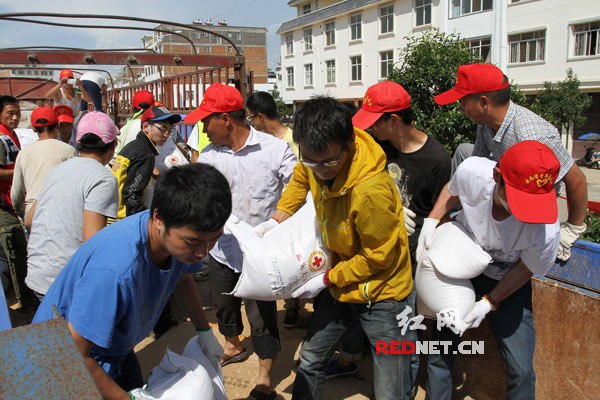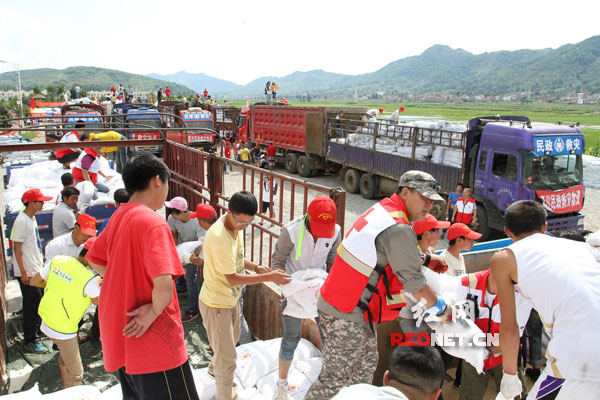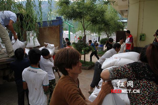 8月8日下午3点,湖南省红十字会紧急援助云南昭通鲁甸地震的第二批物资——20吨大米,经过长途跋涉终于到达鲁甸县城,由于震中龙头山乡道路桥梁的承载力在10吨,不能超重通行,省红十字会在当地设立的物资接收发放点进行了大米转运,下午5点,车队到达小寨乡小寨中学,这里安置了刚刚从另一处存在危险隐患的安置点转过来的甘堡寨村民,地震中,这个村寨有50多人遇难,至今还有不少遇难者的遗体被掩埋在废墟下无法挖掘出来。灾后,他们只能天天吃方便面喝矿泉水度日,住在时刻仍有危险的地段,如今,湖南红十字会送来的大米让他们倍感欣喜,又能在学生宿舍里暂时安顿,让他们心存感激和满足。