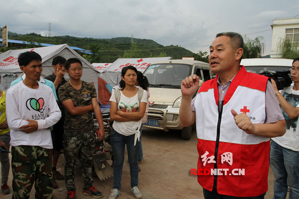 在6日震中龙头山乡堵塞道路被打通后,湖南省红十字会紧急救援队是第一批进入震中的救援队伍,也是最先把捐赠物资直接送到村组受灾群众手中的团体。