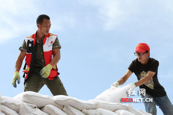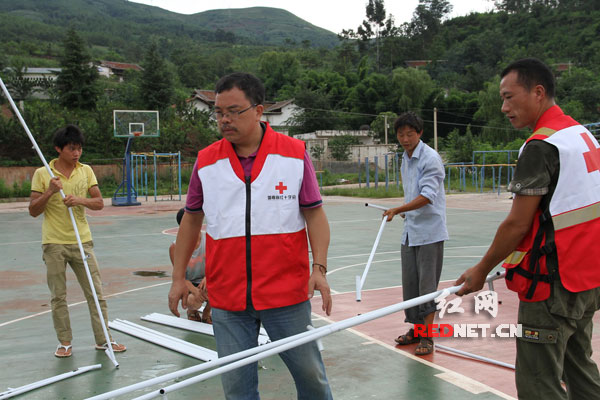 (刚刚帮运完大米,红十字会的工作人员又帮受灾群众搭建起帐篷)