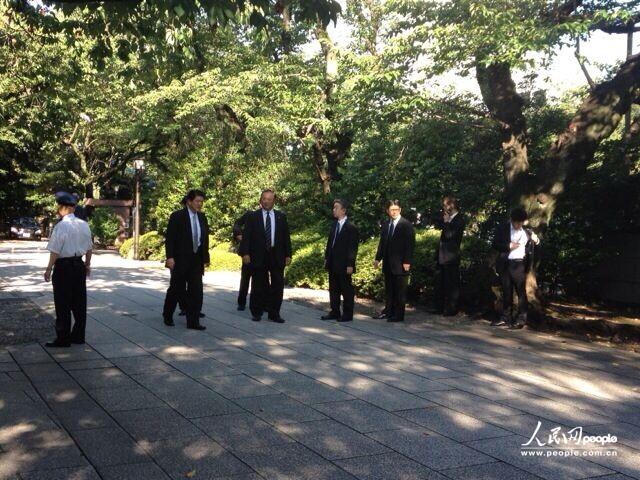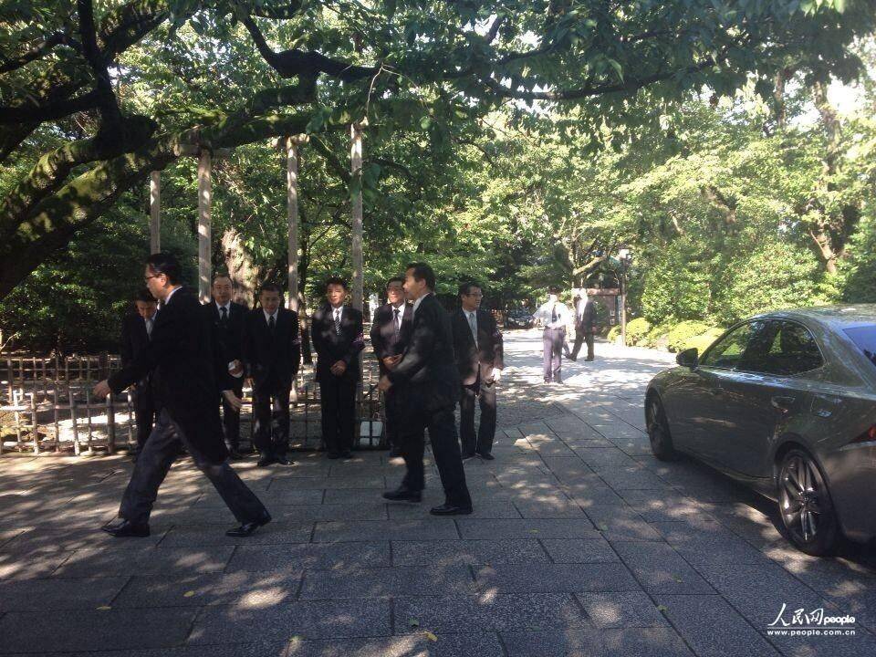 当地时间8月15日上午,日本内阁成员新藤义孝参拜靖国神社。(人民网 赵松摄)