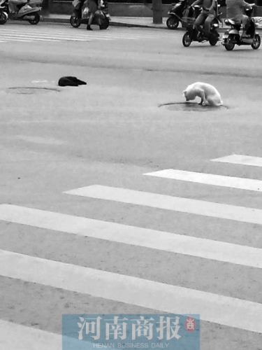 8月14日上午8点,市民刘先生来电称,郑州紫荆山路与东里路交叉口路中间,一白一黑两条小狗过马路,走在前边的小黑狗被飞驰而来的汽车撞了,当场死亡。小黑狗倒地后,同伴小白狗不住地叫,它绕着小黑狗一直转圈,还用鼻子轻轻触碰着同伴的尸体,守在滚滚车流中久久不愿离开。