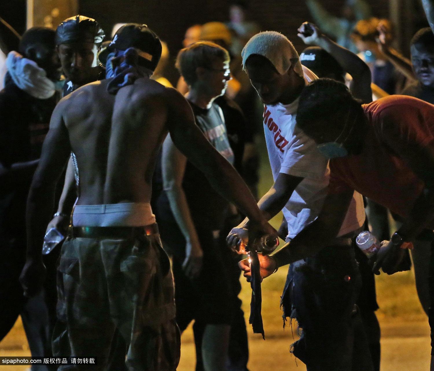 当地时间2014年8月13日,美国密苏里州弗格森市,当日晚,因白人警察射杀黑人青年一事而引发的抗议活动演变成暴力事件,美国密苏里州弗格森市警察局遭人群攻击。(图片来源:SIPA中国)