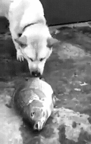 小狗向鱼撩水后,用鼻子触碰鱼身,好似想将鱼“唤醒”。网络截图