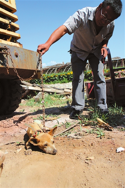 8月13日下午,李师傅的邻居袁师傅在自家门口放羊,原本静静吃草的羊群突然受惊四处乱窜。袁师傅走近一看,发现一只怀孕的母羊不断摆动着脖颈,一只个头不大的“野狗”正恶狠狠地咬着羊的胸口,两只前爪还牢牢扒在羊身上,任凭羊怎么摆动它始终不松口。袁师傅抓起一根木棍打过去,“野狗”才松了口。袁师傅立即冲上去掐住“野狗”的脖颈,将它的头部朝地上猛磕,随后用铁链套住,将其拴在院中。
