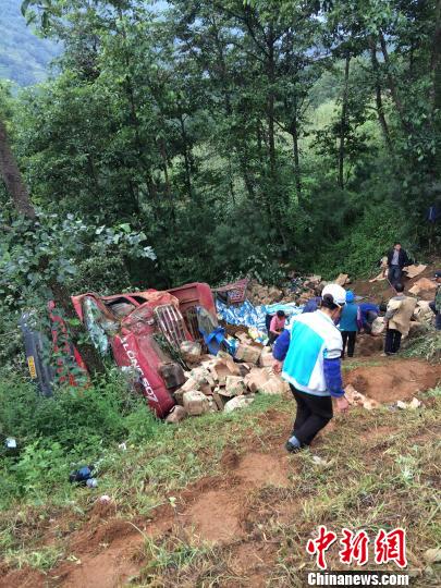 中新网8月19日电 (石啟勇)19日,云南巧家县一辆满载救灾物资的大货车行至该县药山镇法泥村时发生侧翻,翻到数米深的山坡下,造成货车严重变形,救灾物资散落一地,驾驶员受伤。