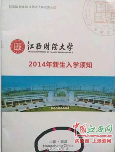 中国江西网讯 记者付婷报道:8月19日,有网友在微博上爆料称,江西财经大学今年的新生入学须知上,误将地名“中国南昌”的英文印成了“Nangchang China”。江西财经大学一工作人员证实,确有此事。