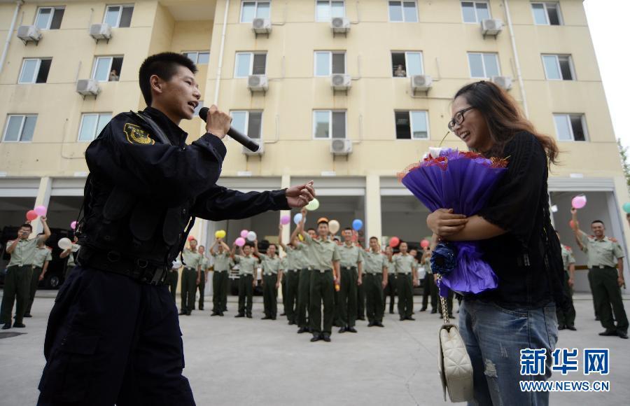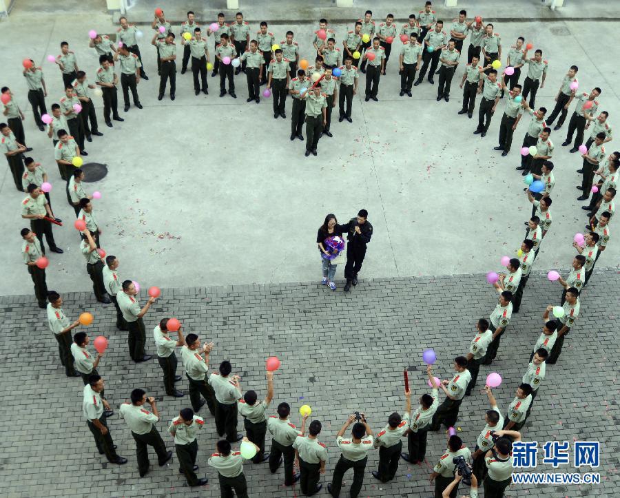 8月19日,在武警江苏总队一支队警营,中尉警官黄海辉向女友沈希求婚。当日,一场浪漫的求婚仪式在武警江苏总队一支队警营上演,为了给相恋1年多的女友沈希一个惊喜,该支队特勤中队中尉警官黄海辉在战友们的帮助下精心策划,以浪漫而具有创意的行为感动了女友,求婚成功。据了解,黄海辉是一名军事技能过硬的特战尖兵,多次在部队军事比武中立功受奖。新华社发 李科 摄 图片来源:新华网