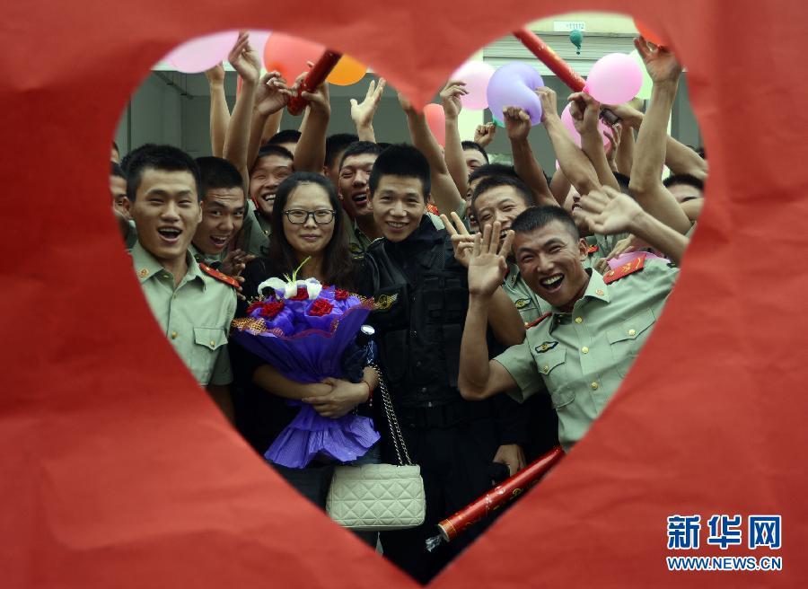 8月19日,在武警江苏总队一支队警营,中尉警官黄海辉带着女友沈希与战友们合影。当日,一场浪漫的求婚仪式在武警江苏总队一支队警营上演,为了给相恋1年多的女友沈希一个惊喜,该支队特勤中队中尉警官黄海辉在战友们的帮助下精心策划,以浪漫而具有创意的行为感动了女友,求婚成功。据了解,黄海辉是一名军事技能过硬的特战尖兵,多次在部队军事比武中立功受奖。新华社发 李科 摄 图片来源:新华网