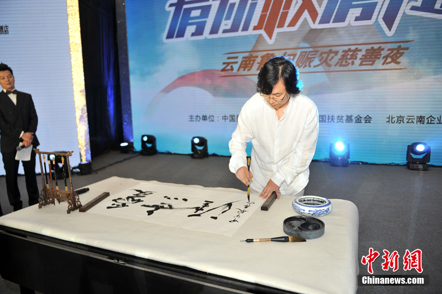 图为廖昌永现场创作书法作品拍卖。 中新网记者 金硕 摄