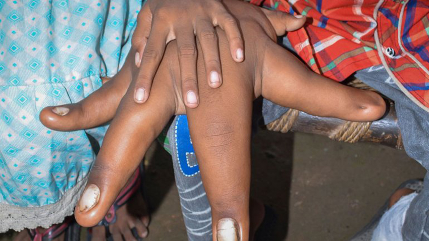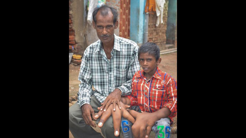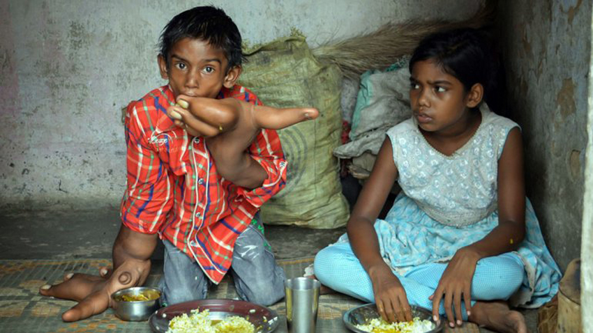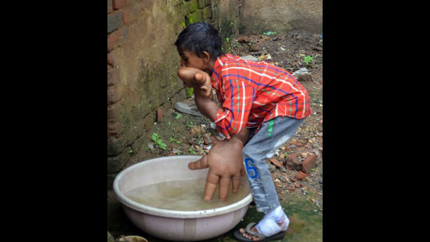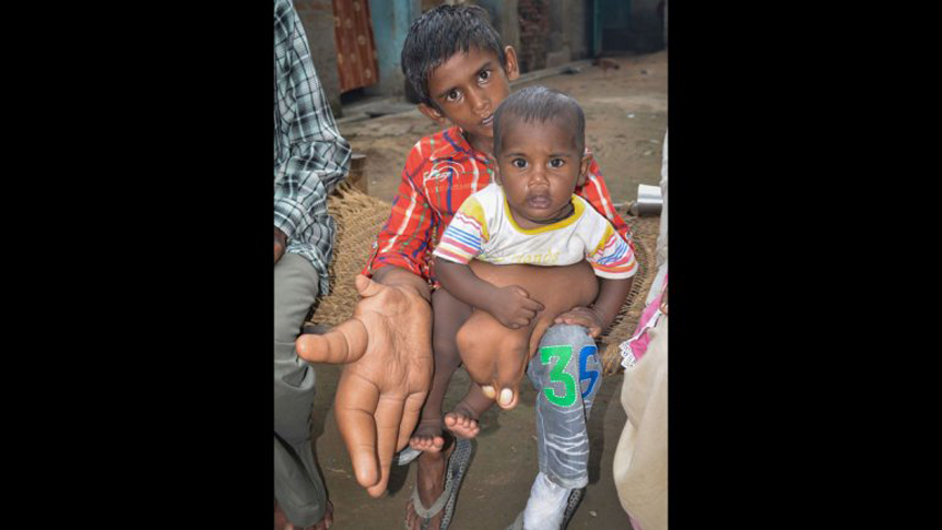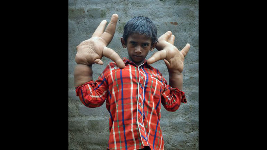 印度男孩患罕见疾病 每只手重8公斤(网页截图)