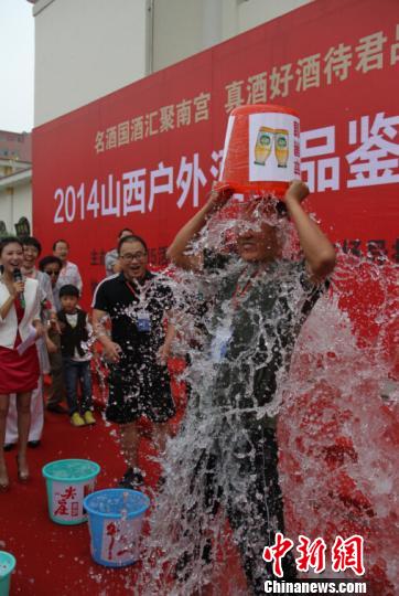 30日,2014山西户外酒类品鉴团购会现场,上演了一场冰桶接力挑战赛,被点名的人不仅接受挑战,还为此前媒体报道的山西“渐冻人”李翠红进行捐款。 范丽芳 摄