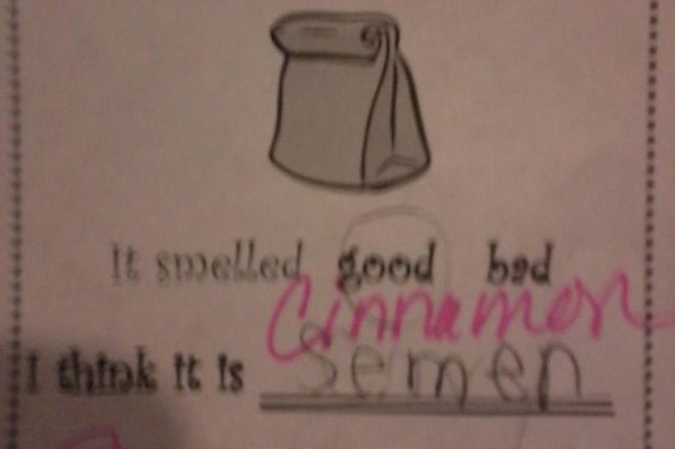 据悉,该学生当时在上科学课,老师布置的任务是通过闻气味辨别袋子里的东西。该学生很轻松地闻出袋子里是肉桂,并且记录下味道“好闻”!然而他却误将肉桂拼写成了“精子”。