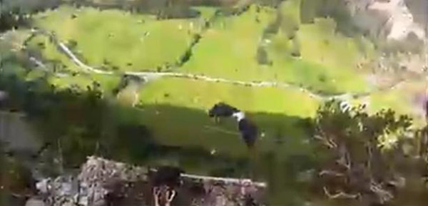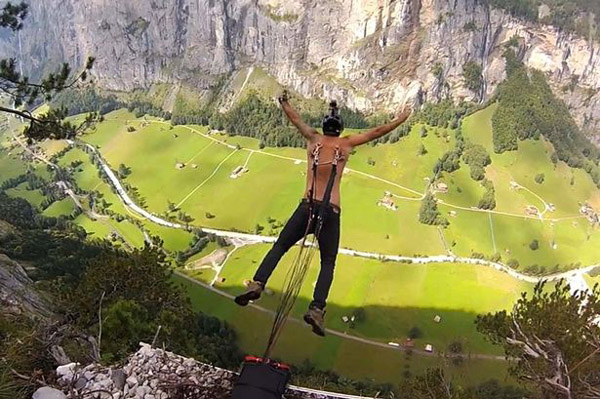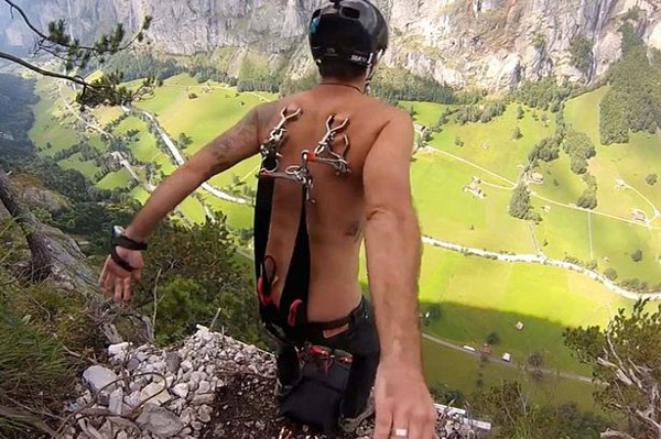 俄男子铁钩穿背玩跳伞,跳下400米悬崖。