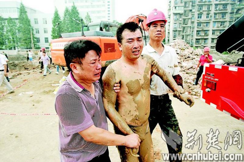 图为:救人成功后,工友钱师傅(中)和工头喜极而泣。图片来源:荆楚网