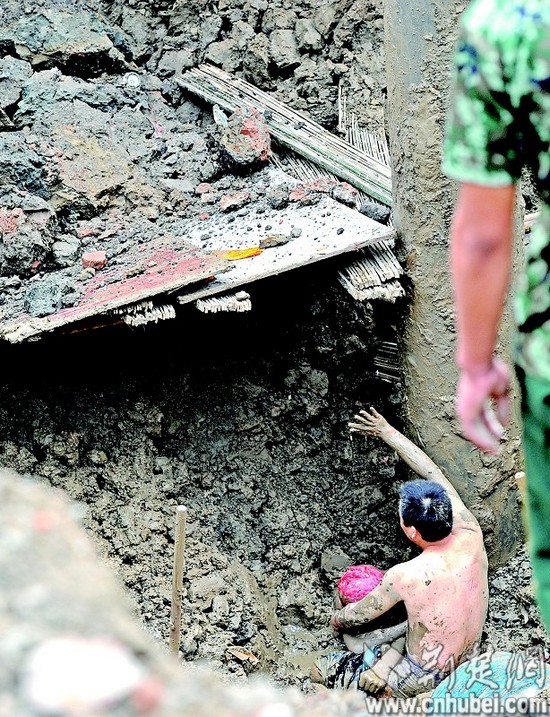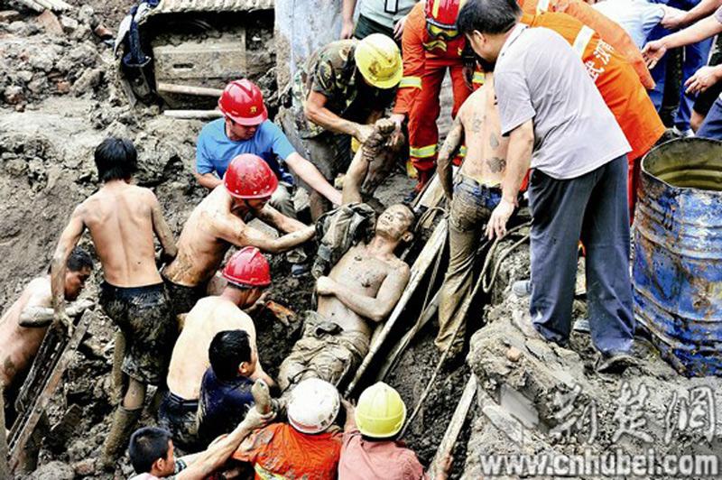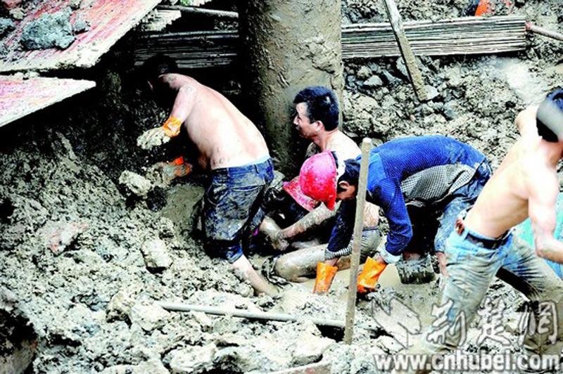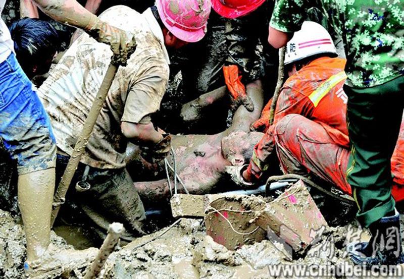 图为:工友在被埋测量员周围徒手刨泥土。图片来源:荆楚网