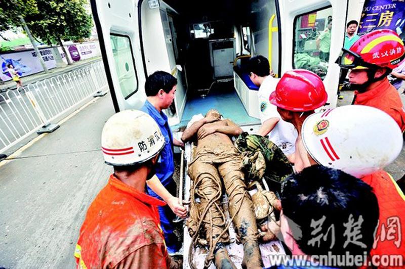 据医院介绍,被埋测量员头、胸、背部及四肢有擦伤和瘀斑,其中头部有三公分长破口,腰椎横突有骨折,目前生命体征稳定。图片来源:荆楚网