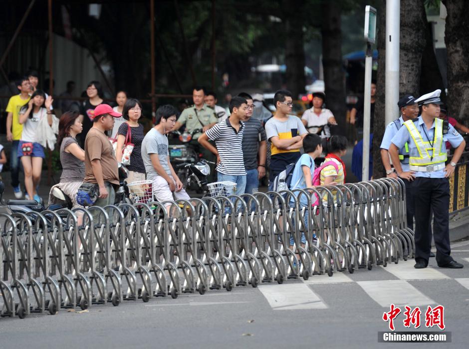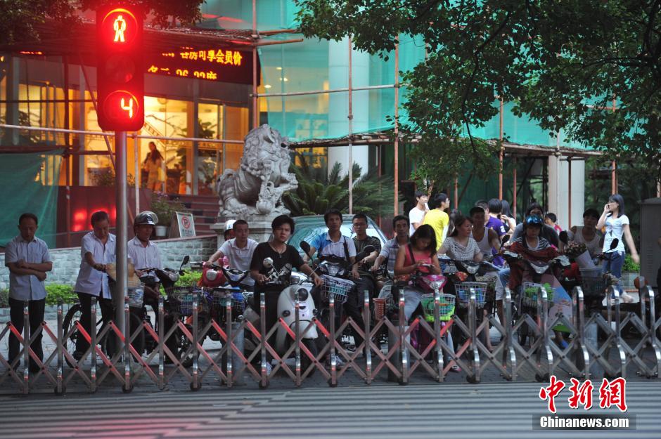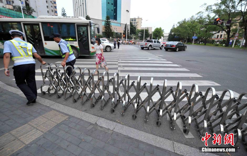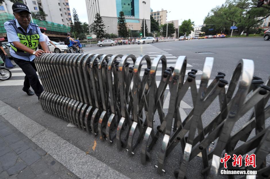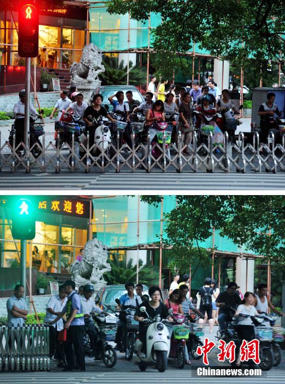 9月12日,福州警方在十字路口设置伸缩护栏。近日,在福州福飞南路与铜盘路交叉口,以及华林路与北大路交叉口,设置了能够伸缩高约1米的护栏。每个护栏由一名协管员负责,在早晚高峰期时段,当斑马线红灯时关闭护栏,阻挡闯行红灯的行人与非机动车,确保安全通行。据了解,伸缩护栏作为一种全新的尝试,是否长期使用或者在全市范围推广,取决于试运行的效果。 中新社发 张斌 摄