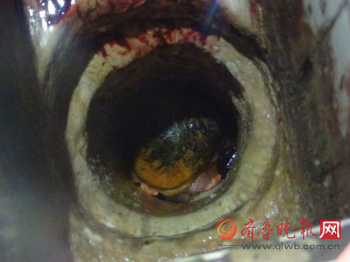 经勘察发现,该公寓厕所下水道的排便管道材质为生 铸铁,管口直径不足20厘米,女婴牢牢地卡在厕所的排便道内,不时发出微弱的啼哭声。目测女婴在排便口下约1.2 米,女婴头上覆盖着废弃的卫生纸,且被血水和污垢浸湿 。
