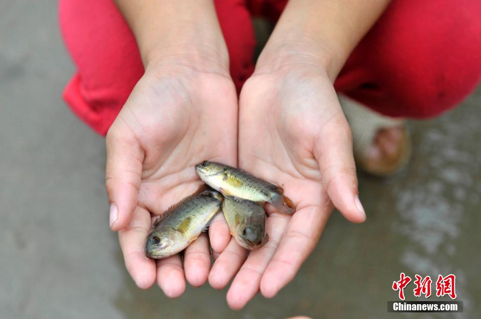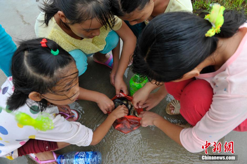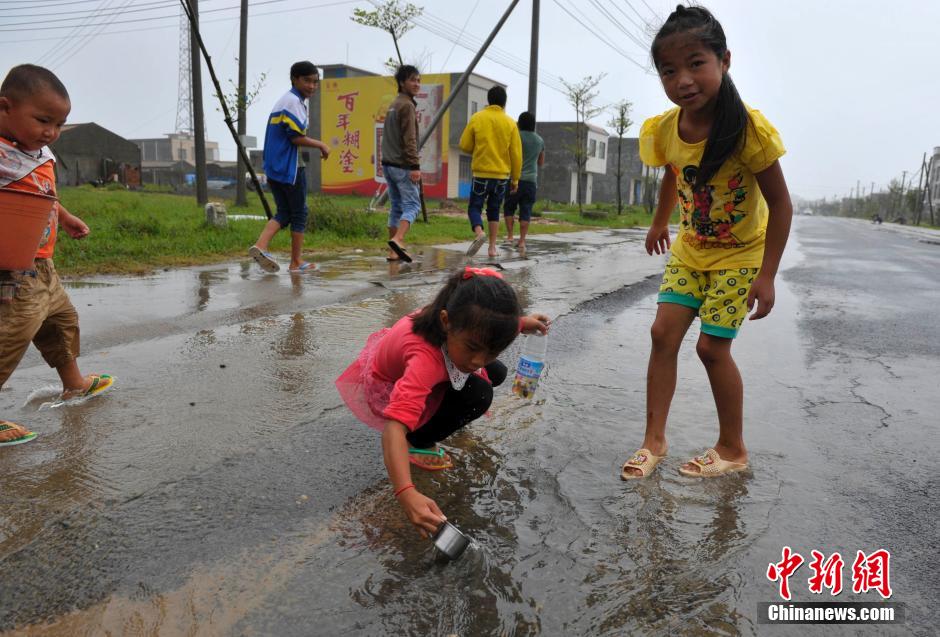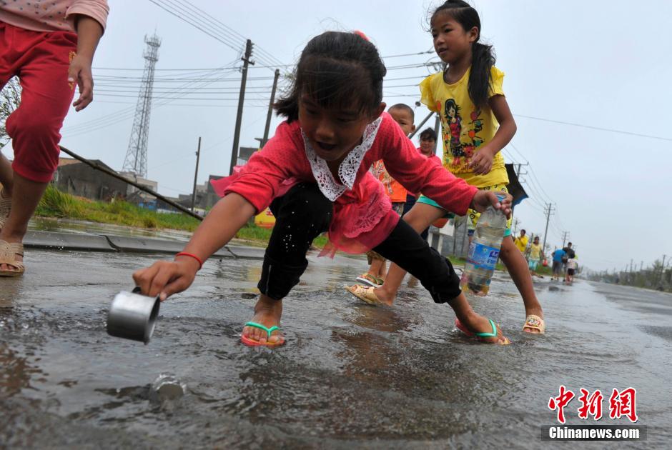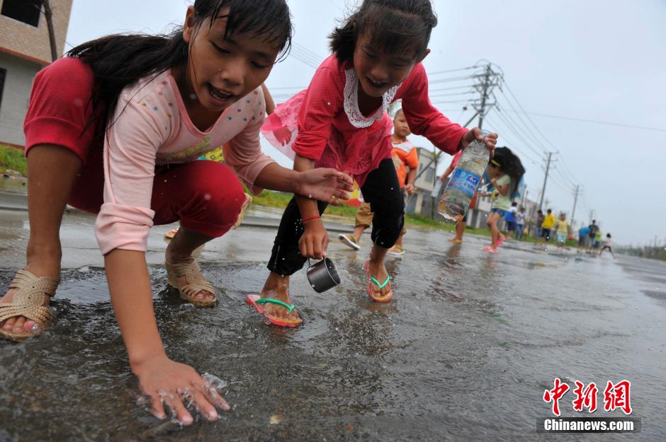 9月16日,台风“海鸥”当日9时40分前后在海南省文昌市翁田镇沿海登陆,登陆时中心附近最大风力为13级.与两个月前的“威马逊”登陆地点相同,不过强度较弱。风眼中的文昌显得十分平静,记者在文昌市冯坡镇看到,许多村民手持水桶、塑料瓶等,在街道旁的积水中抓鱼。 中新社发 骆云飞 摄