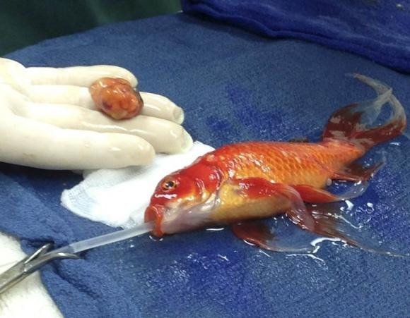 十岁的宠物金鱼在接受手术