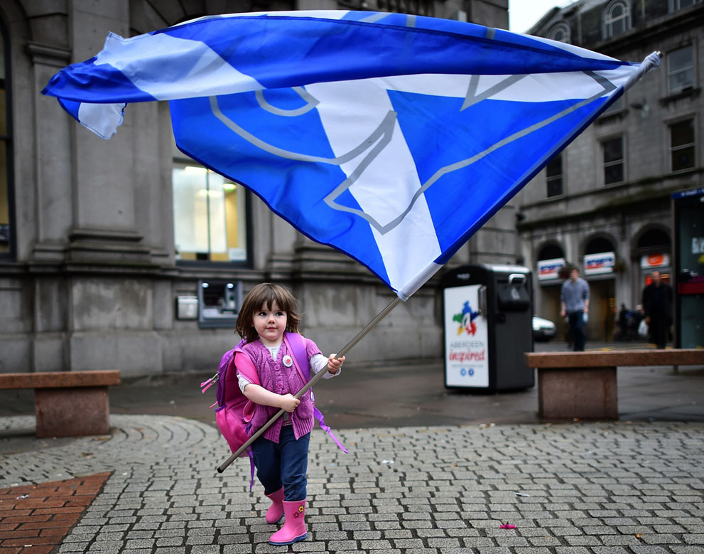 2014年9月15日,苏格兰阿伯丁街头,一名儿童挥舞着支持独立的标有“要”字的旗帜。