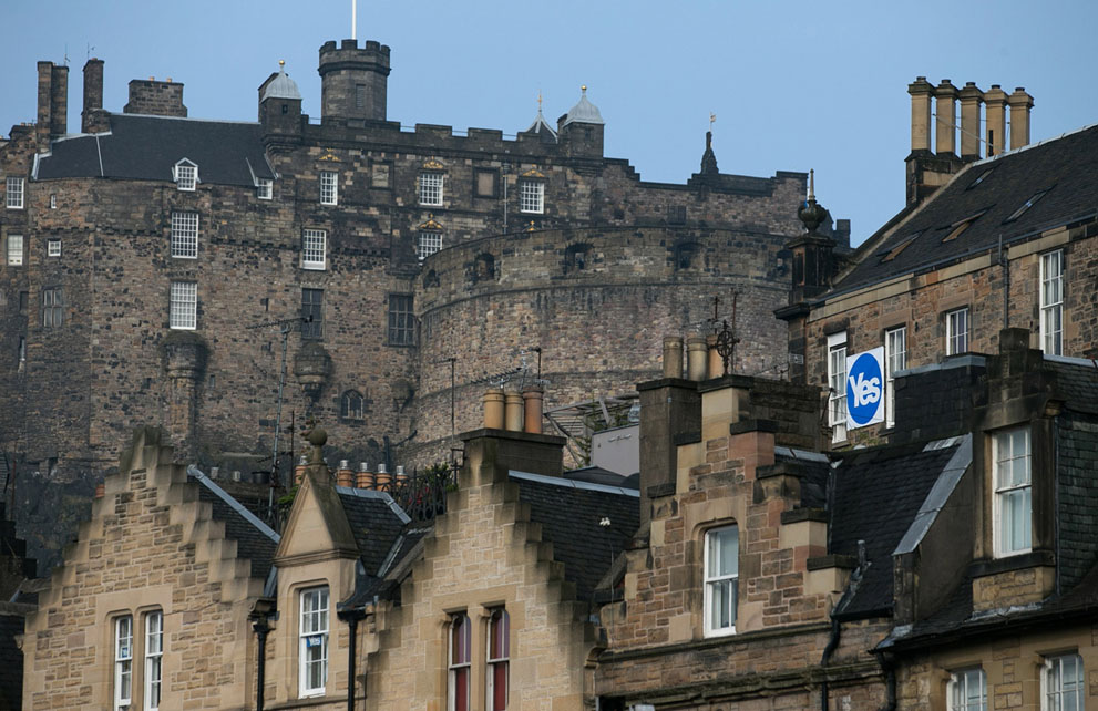 2014年9月13日,苏格兰爱丁堡旧城区,一座居民楼上张贴着支持独立的海报。