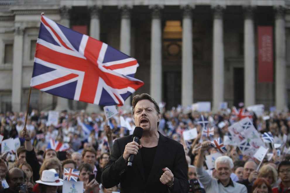 2014年9月15日,伦敦市中心的特拉法加广场,艾迪·伊扎尔德在一个支持独立的民众集会上发表演讲,参加集会的民众都是“让我们在一起”运动的支持者。