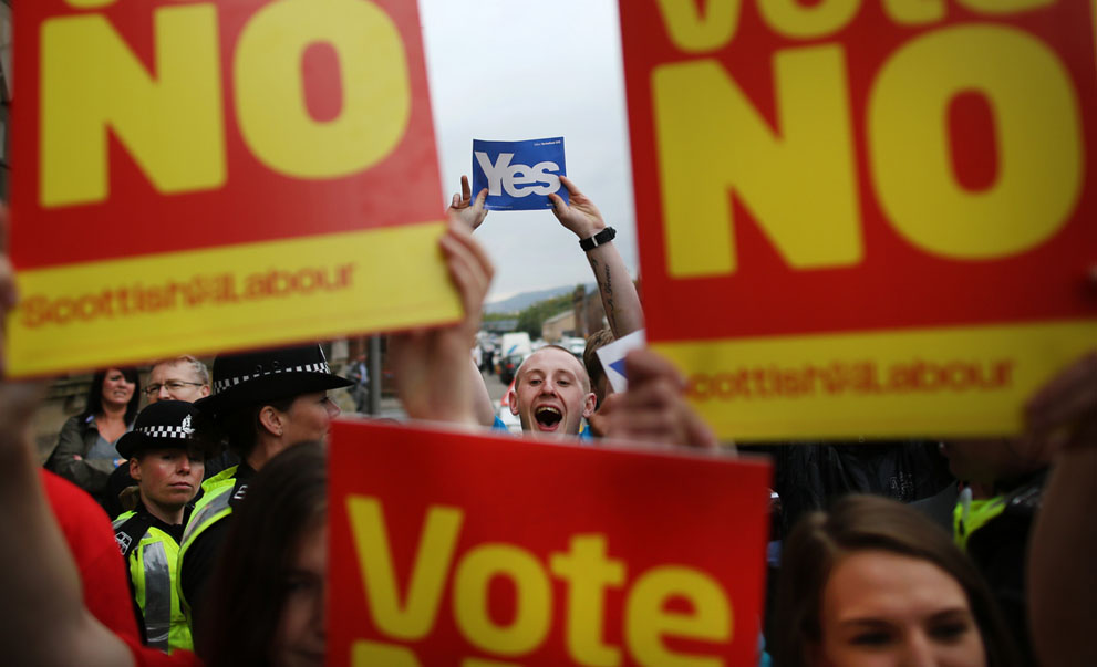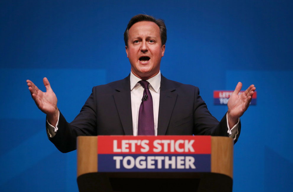 2014年9月15日,英国首相大卫·卡梅伦(David Cameron)在苏格兰的阿伯丁(Aberdeen)发表“反投票”演讲。